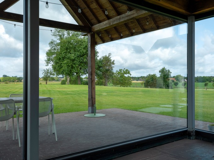 Een bijzonderheid zijn de glas-op-glas hoeken, zoals in het poolhouse. Deze techniek creëert een naadloze overgang tussen twee glaspartijen, waardoor de hoek volledig uit glas bestaat zonder onderbrekende profielen. Dit zorgt voor een ongehinderd uitzicht en een bijzonder ruimtelijk effect.